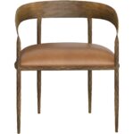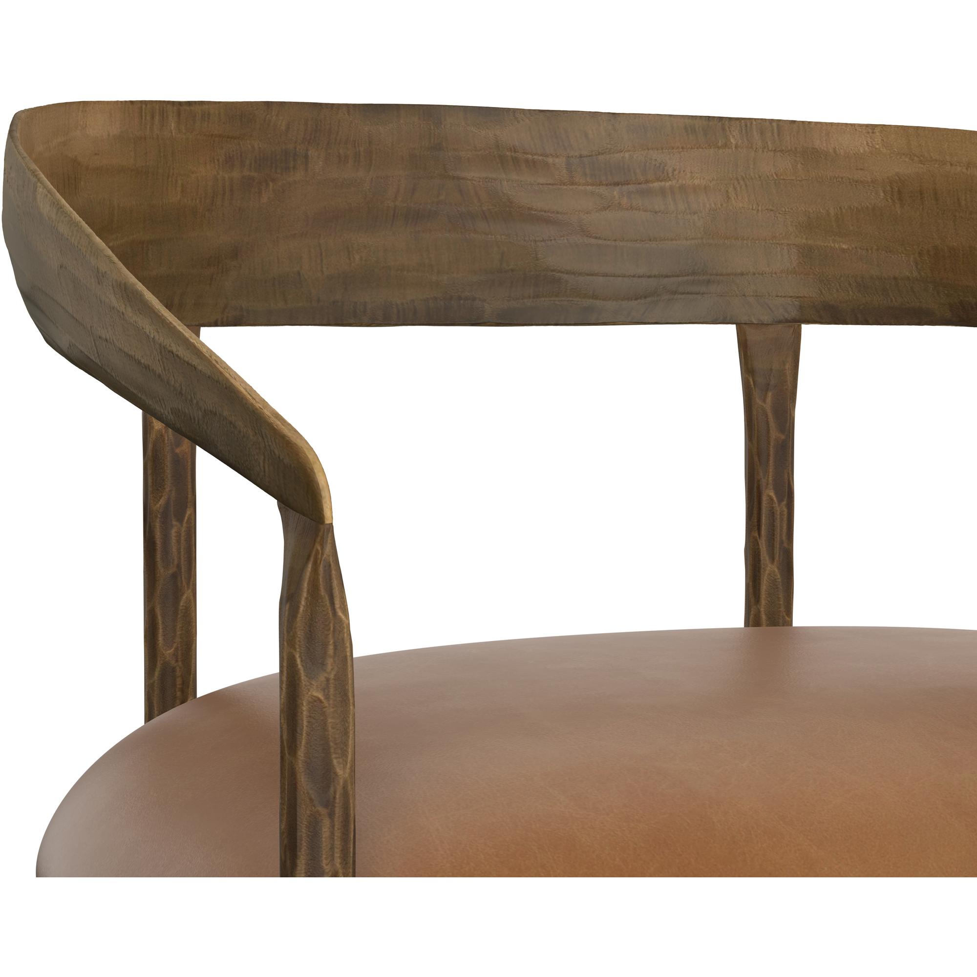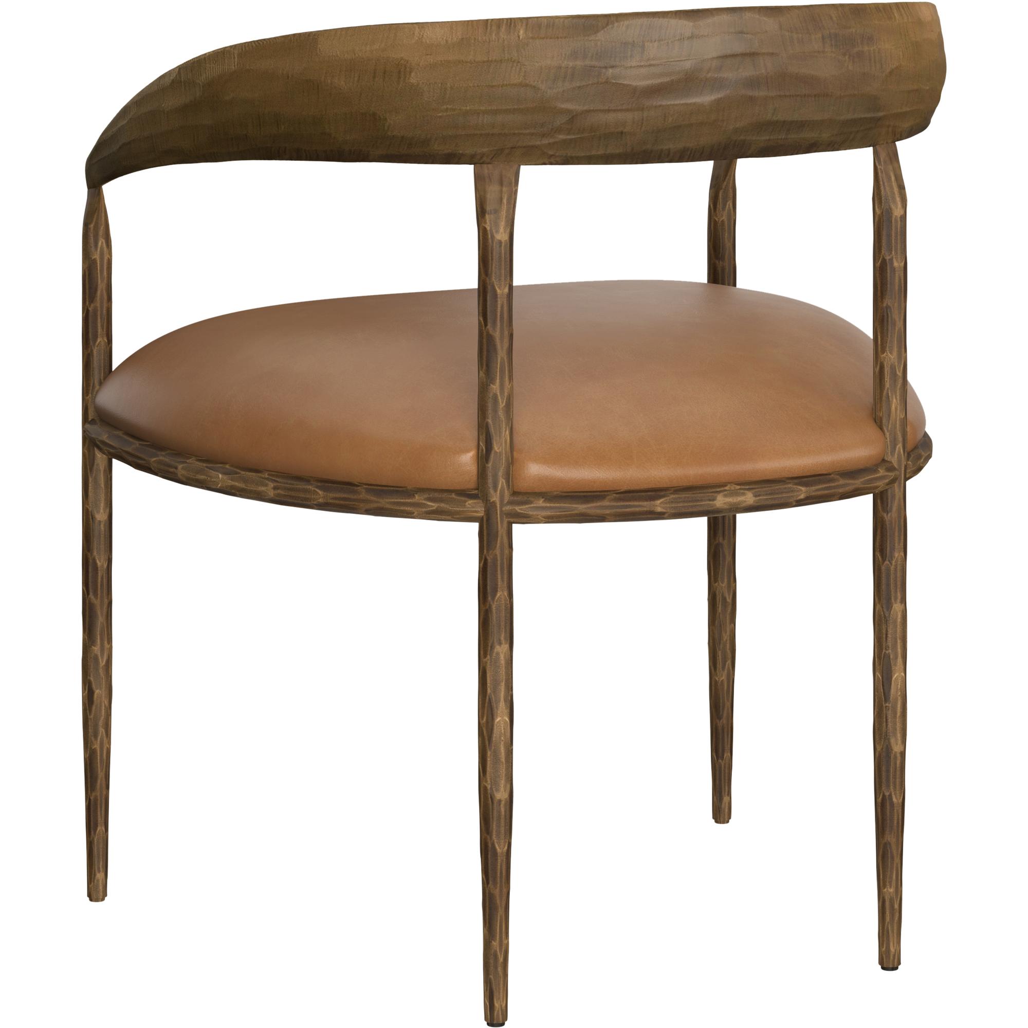 The Zanatta Dining Armchair is all about the subtle details. The hammered metal detailing in the antique brass curved frame provides visual interest that will stand out in any dining space. A tan leather seat completes the look. Handle with Care: This design has been crafted with aniline leather. Leather is a natural material; as such, colour variations, markings, wrinkles, grooves and light scratches are acceptable and appreciated characteristics. No two pieces are alike. Visit our Product Care page for more information on how to ensure the lasting beauty of this piece. Made in India. With refined craftsmanship, this design was brought to life by skilled local artisans. Due to the nature of handcraftsmanship, unique imperfections such as fissures, markings and variations in colour and shape are welcomed and appreciated characteristics for a truly one-of-a-kind piece.