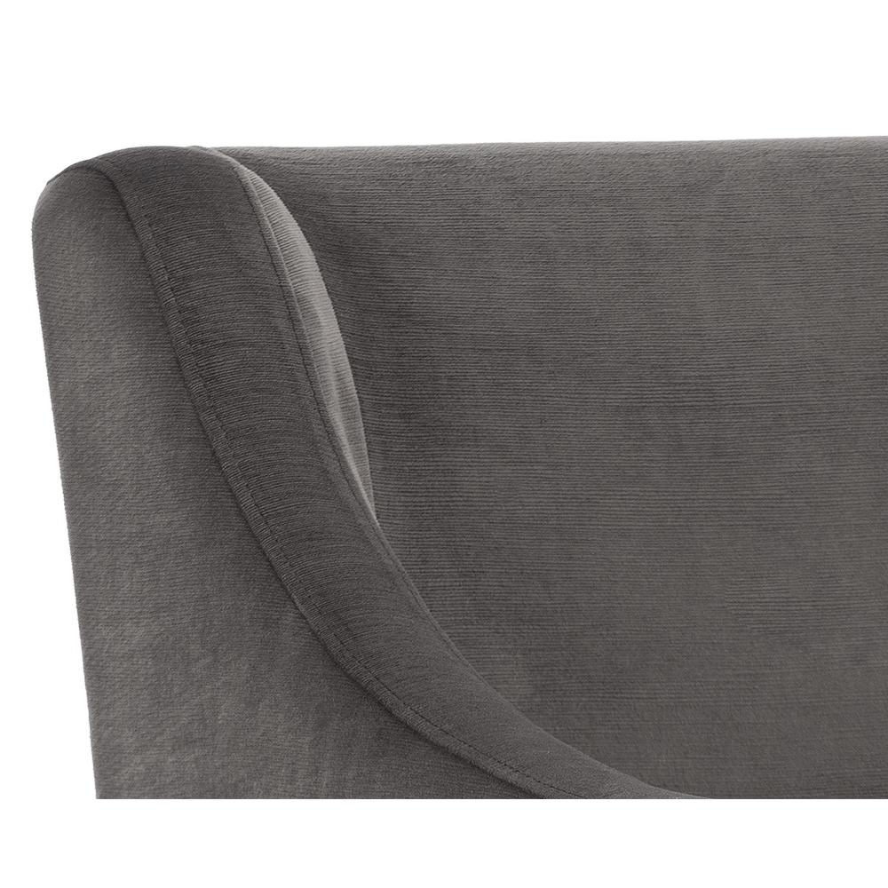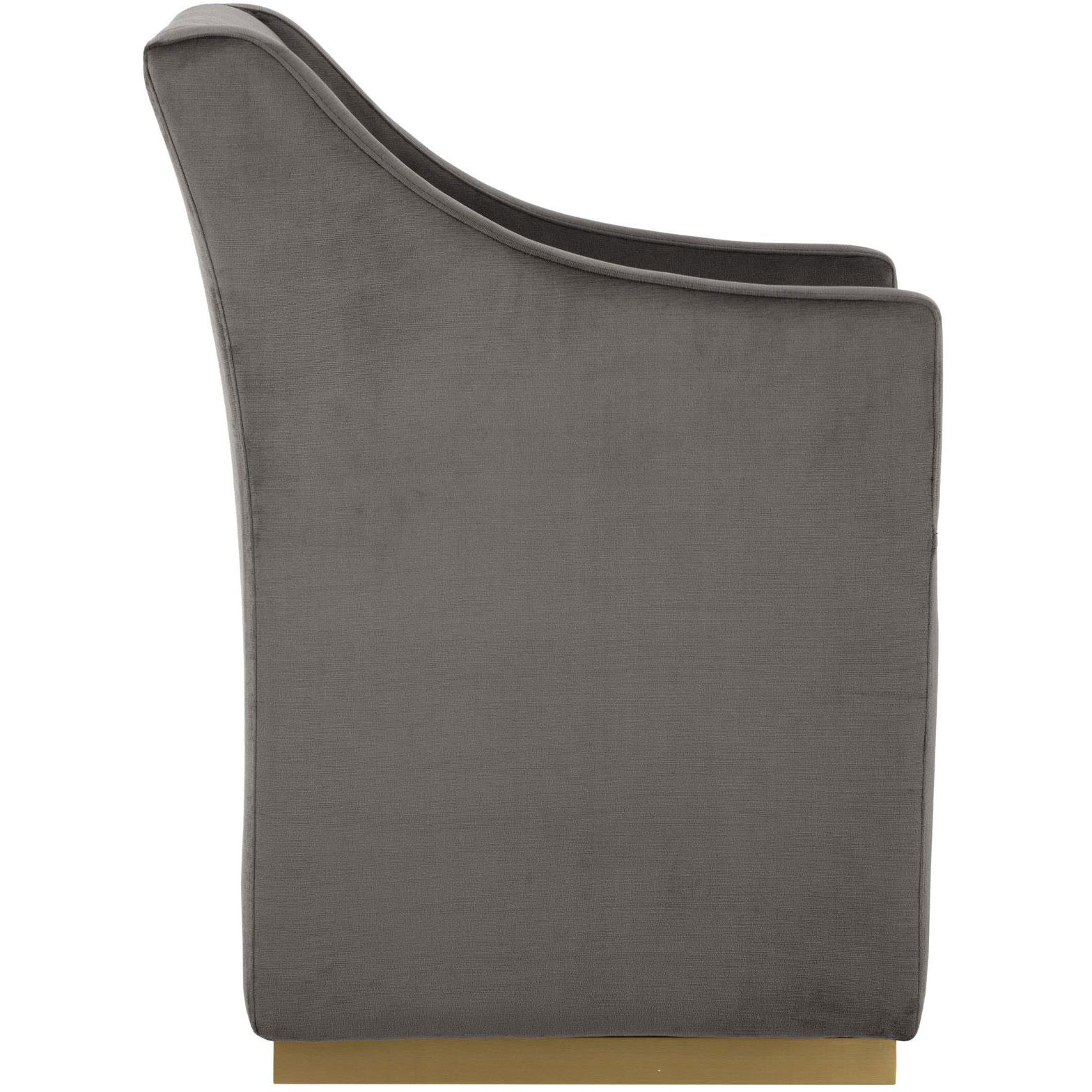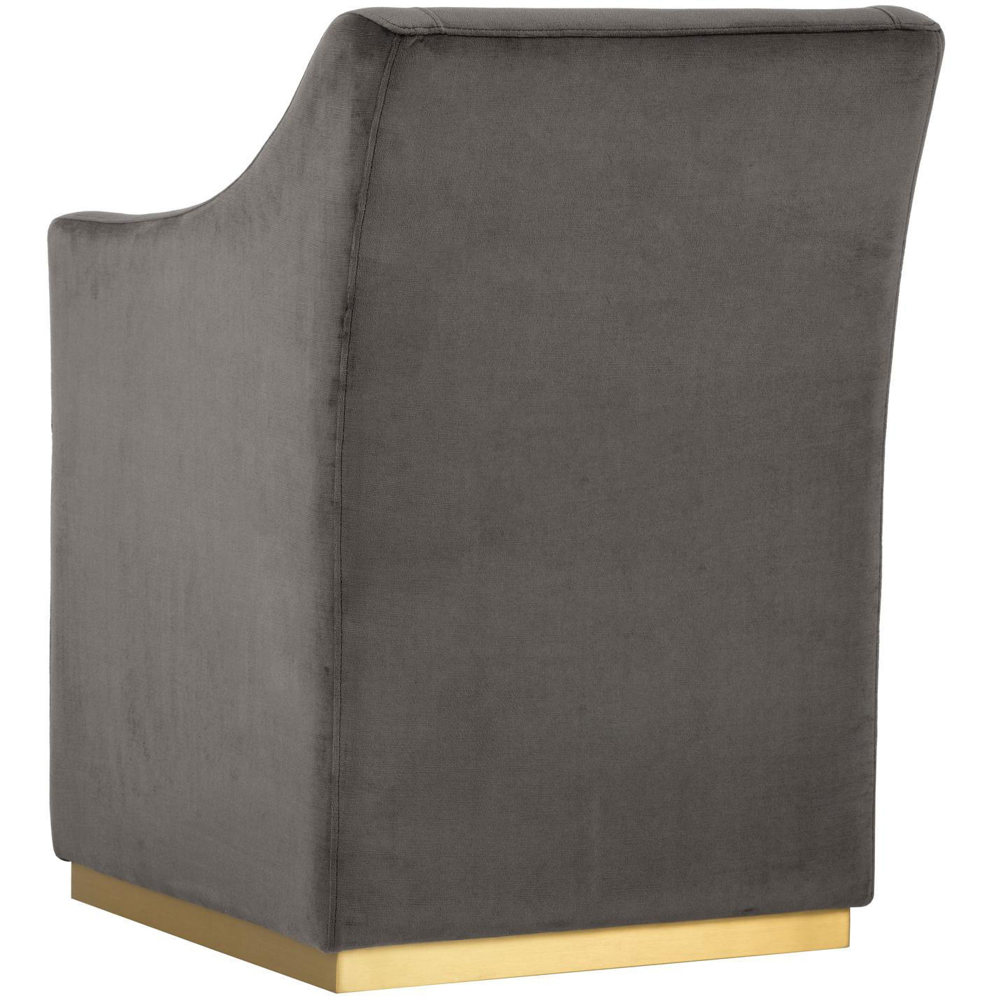 An eye-catching, ultra glamourous wheeled lounge chair. Stocked in our piccolo pebble performance fabric with a brushed brass steel frame. Sophistication and comfort fit for various dining and lounge spaces. Performance fabric is moisture repellent, durable and easy to clean.