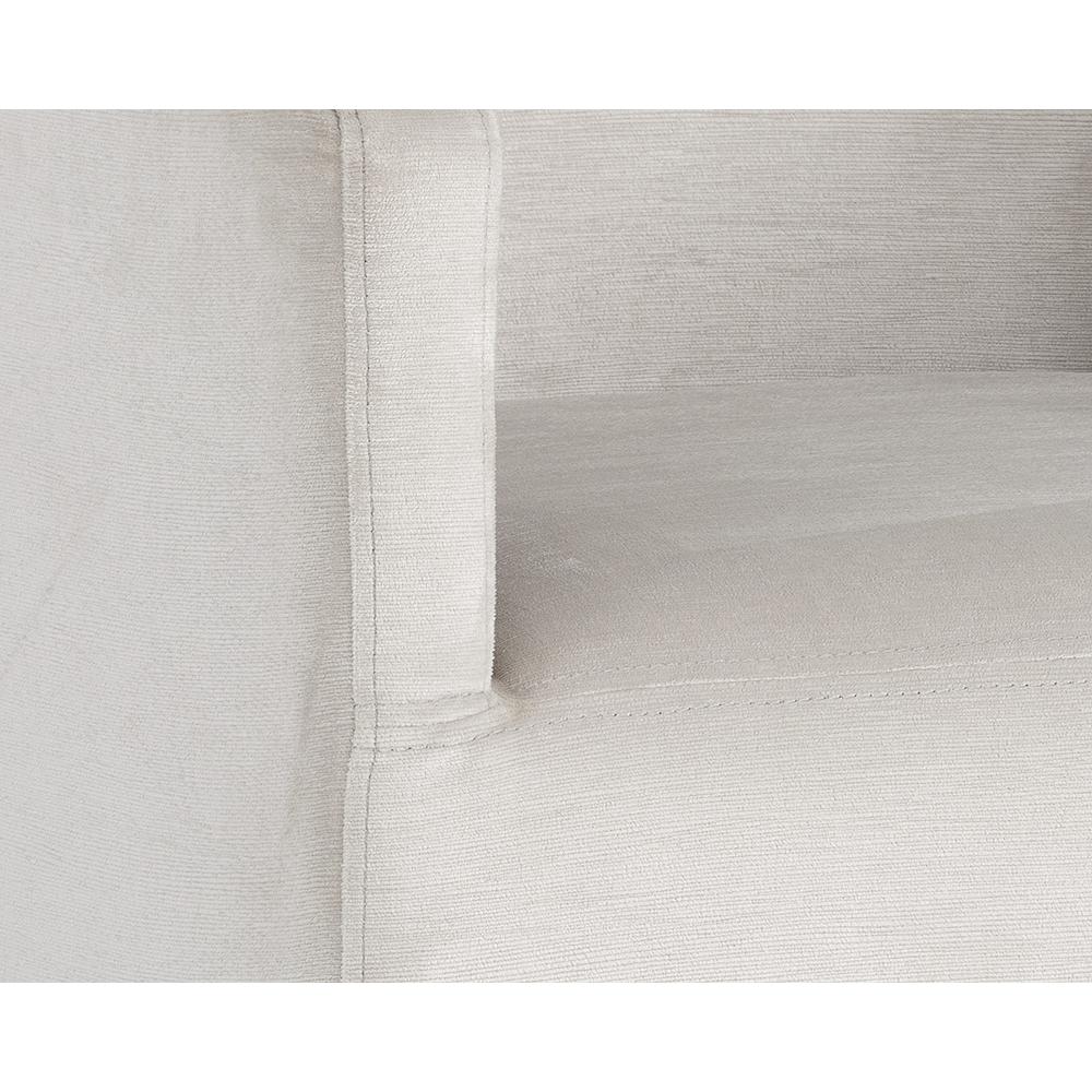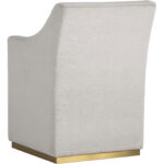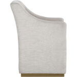 An eye-catching, ultra glamourous wheeled lounge chair. Stocked in our piccolo prosecco performance fabric with a brushed brass steel frame. Sophistication and comfort fit for various dining and lounge spaces. Performance fabric is moisture repellant, durable and easy to clean.