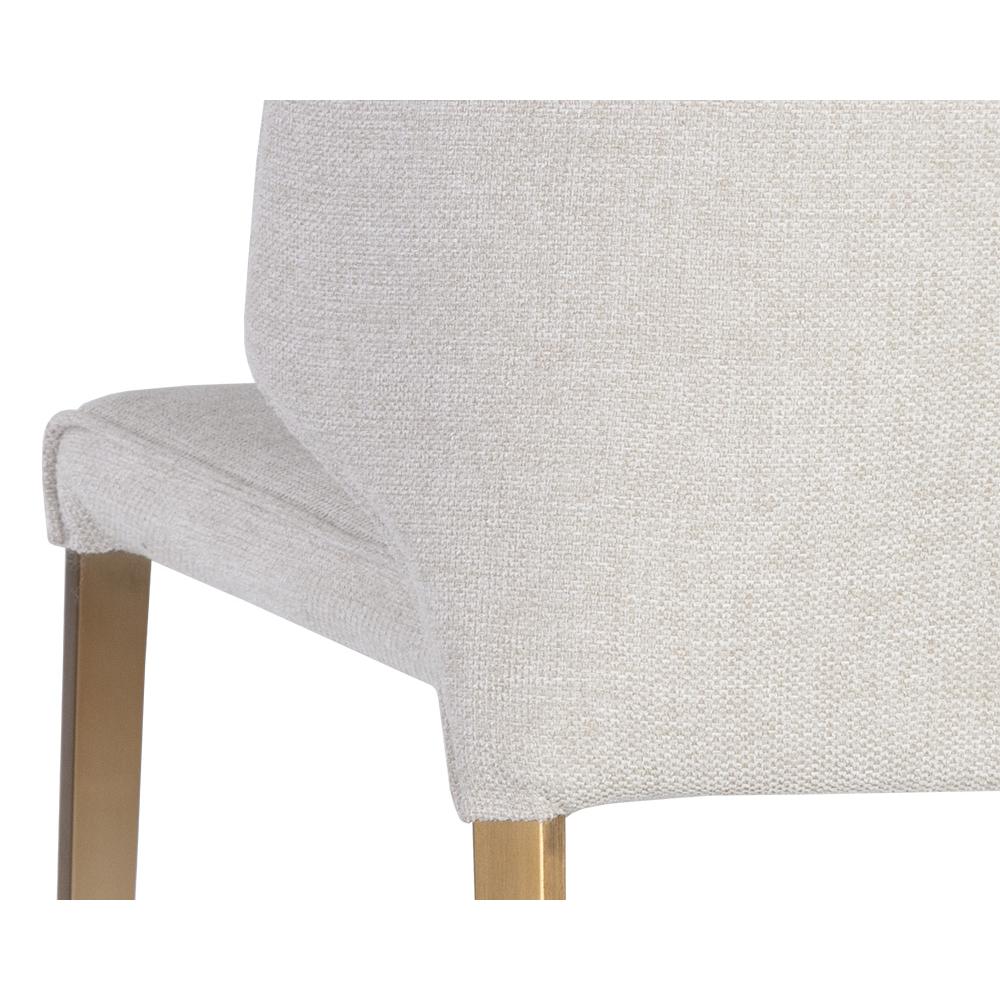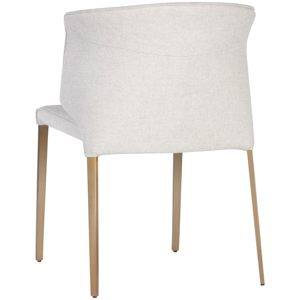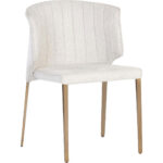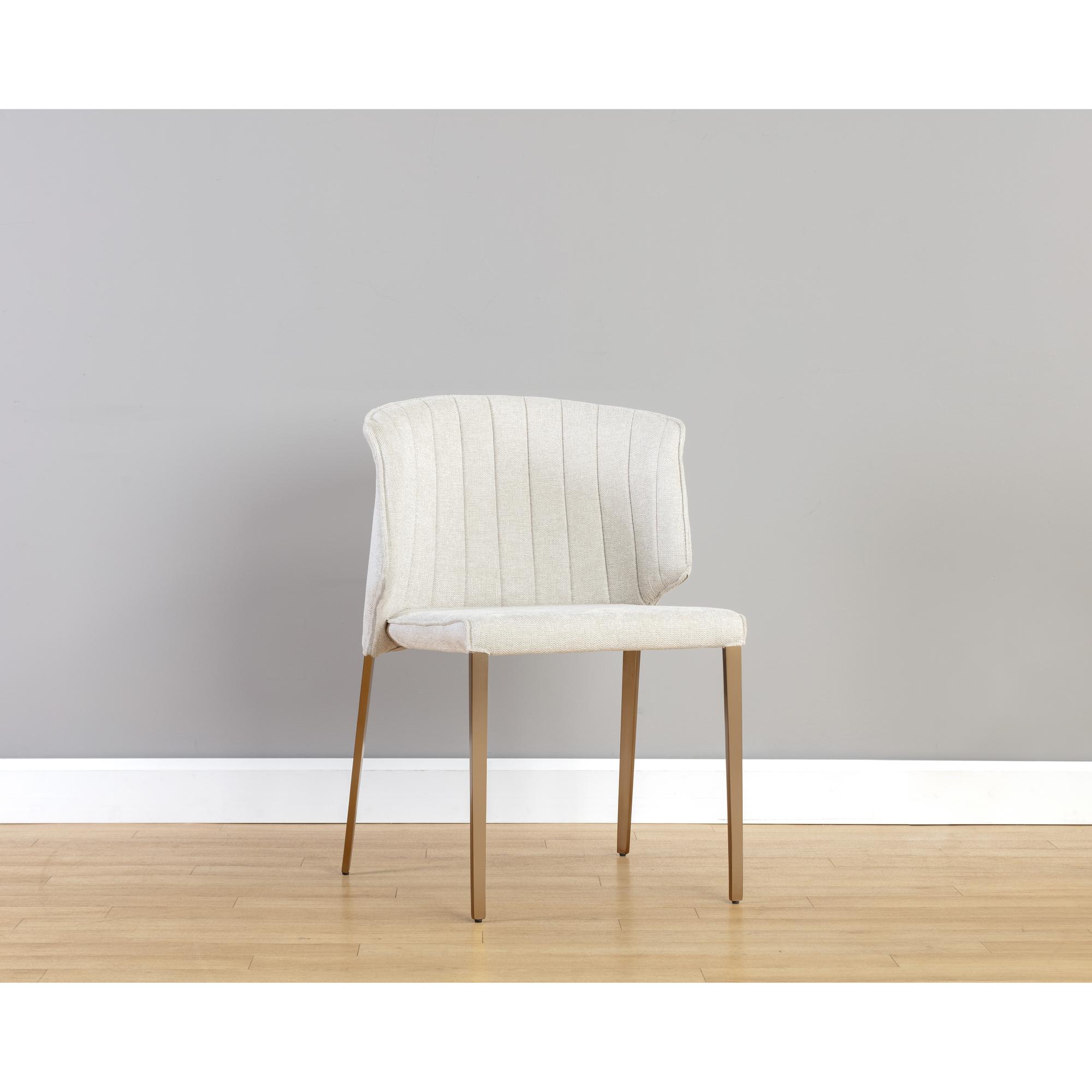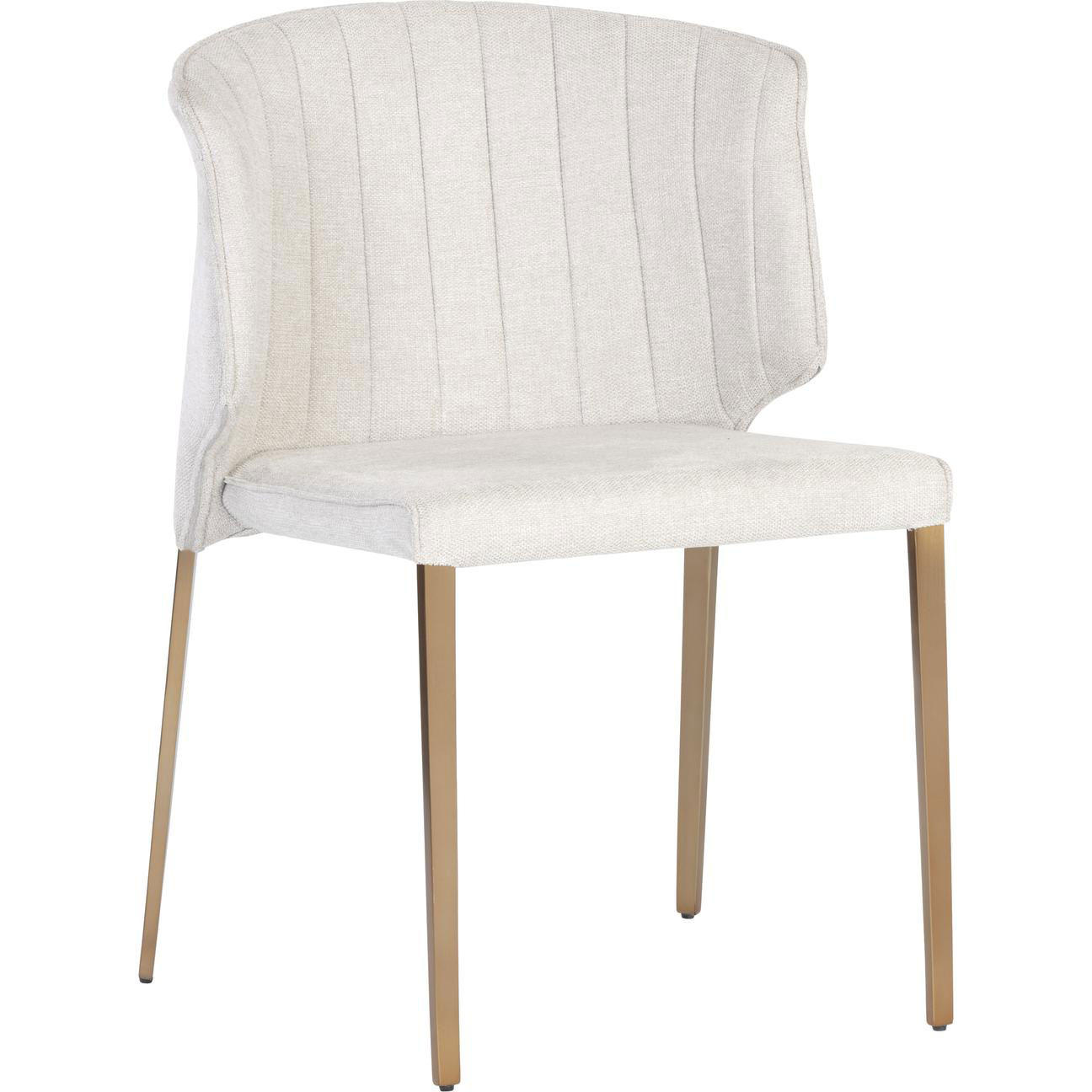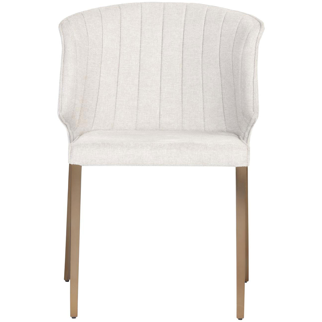Fine and compact, this modern dining chair features a well-structured curved backrest with vertical tufting on the interior. Stocked in belfast oatmeal fabric and completed with stainless steel legs in a gold finish.