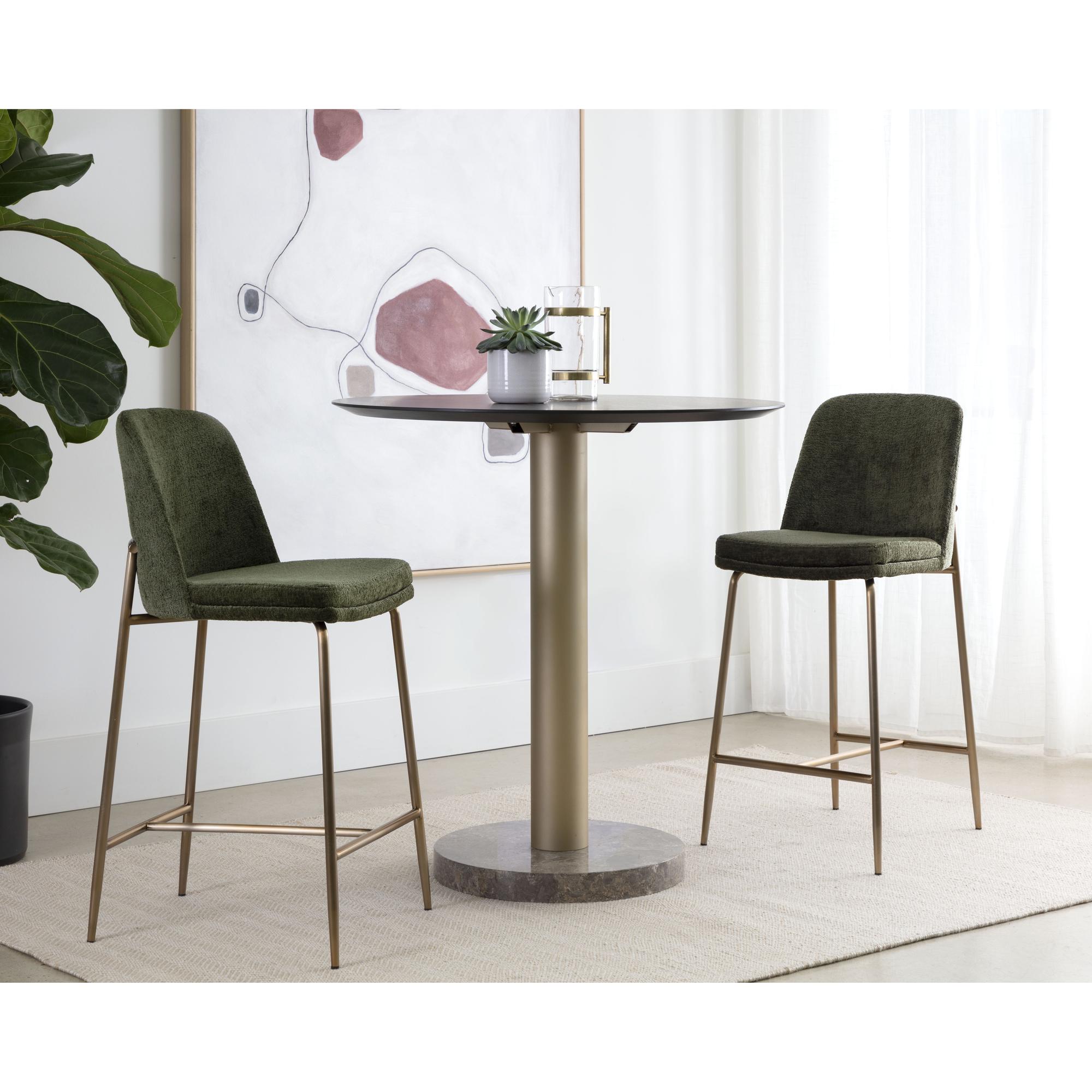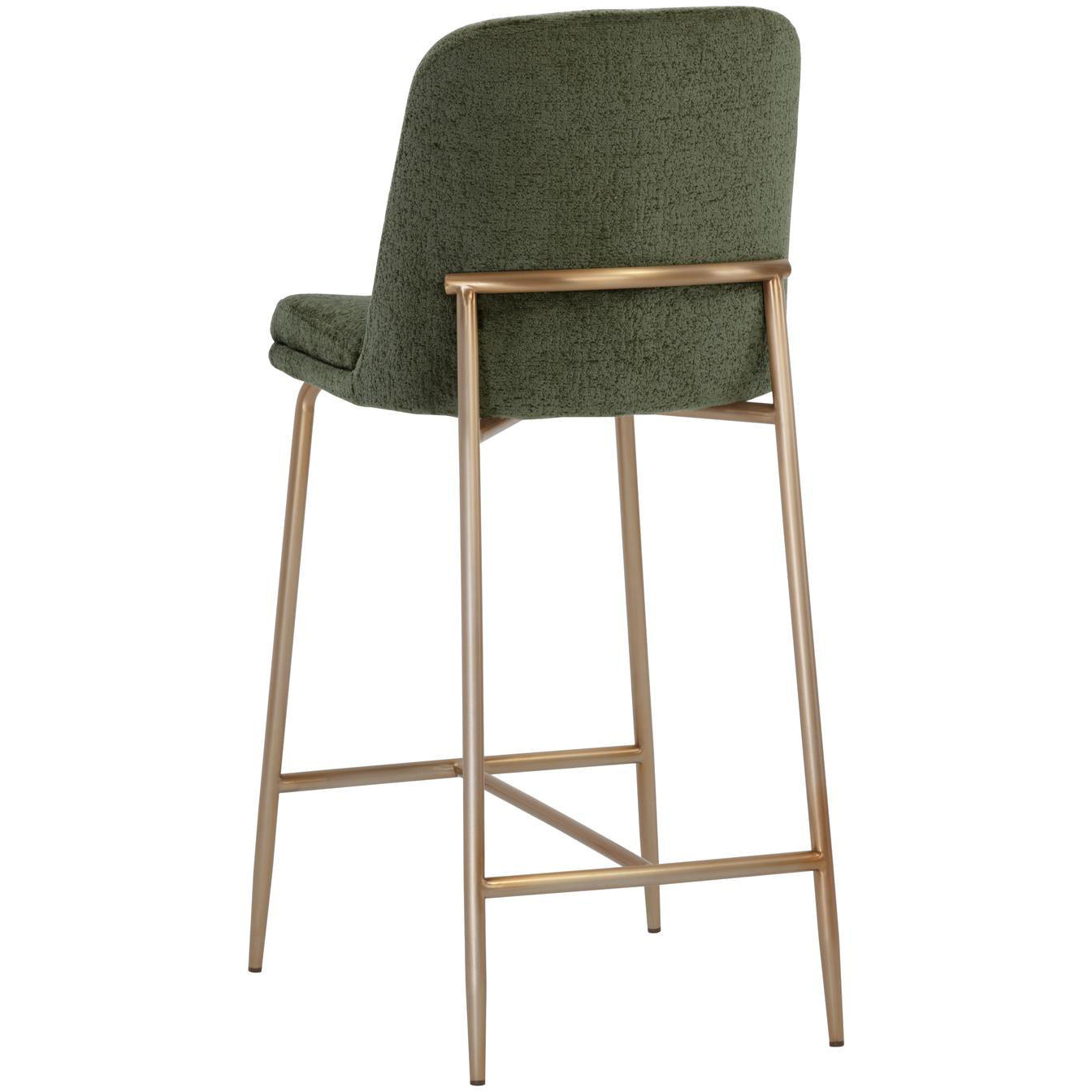 This stylish counter stool features a classic silhouette that provides comfortable seating in any modern living space. Features an antique brass stainless steel frame and curved backrest upholstered in bergen olive fabric.
