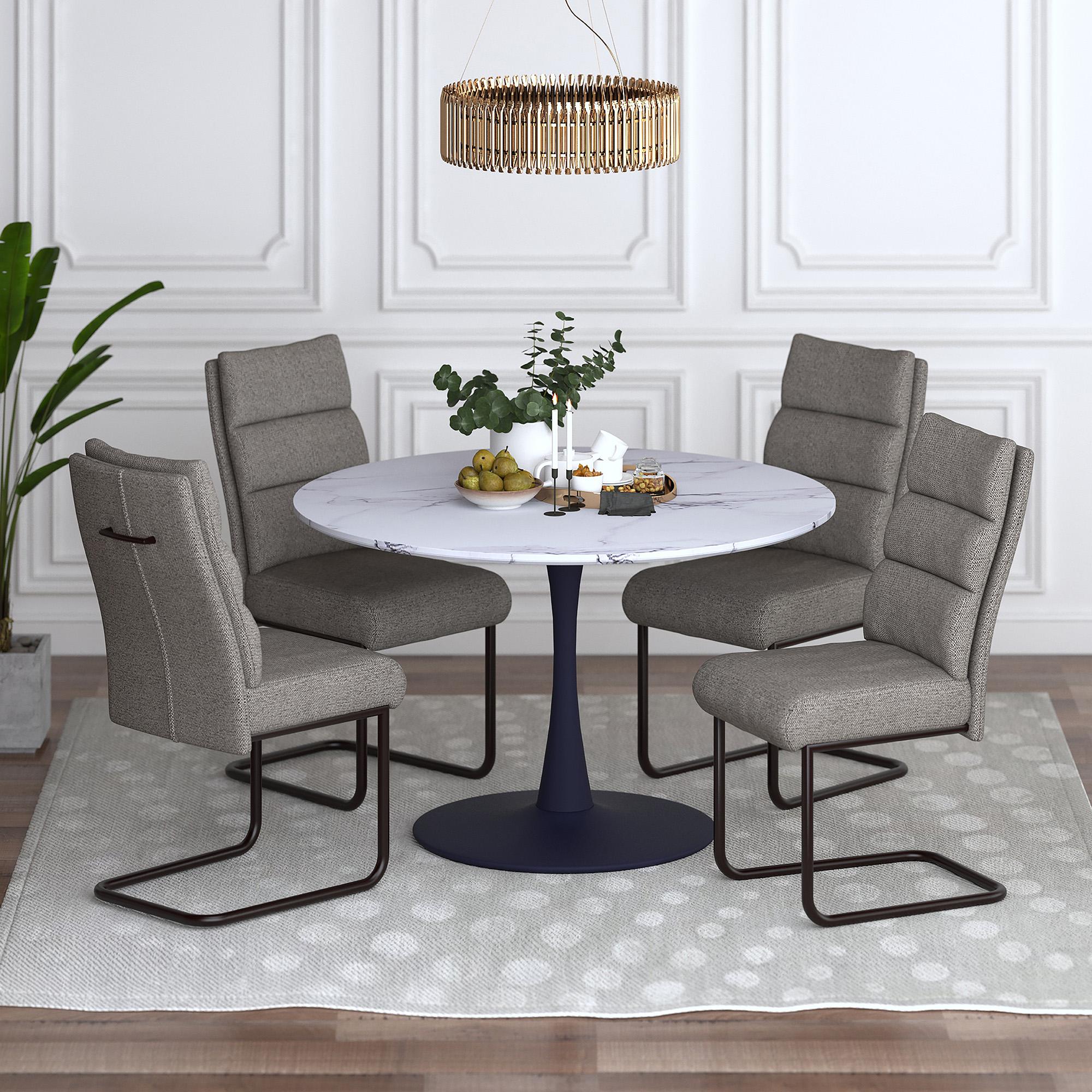 This sturdy pedestal dining table will easily become the centrepiece of your dining space. The curves of the base provide mid-century appeal while the faux marble top gives a modern touch. Irresistible dining chairs, perfect for formal or casual dining experiences. The textured fabric is visually appealing while still being comfortable and easy to wipe clean. The high back design will provide hours of study seated comfort. Details like the stitching and the metal handle on the back of the chair with elevate your decor and bring character to the space.