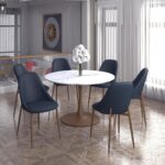 This sturdy pedestal dining table will easily become the centrepiece of your dining space. The curves of the base provide mid-century appeal while the faux marble top gives a modern touch. Comfortably fit up to 6 chairs, great for formal or casual dining. Leisurely meal times will be easy when you have this chair at your dining table. The wing style is a comforting hug and the plush cushioning will provide hours of comfort. Modern faux leather upholstery is easy to clean and the aged gold legs provide an air of luxury.
