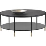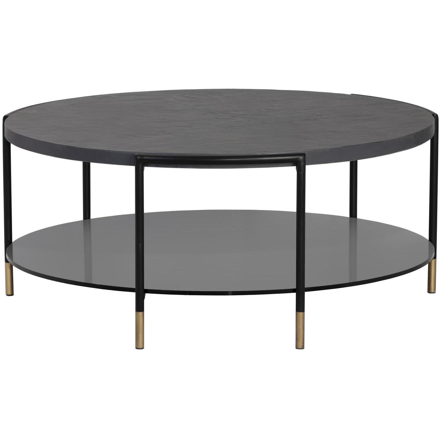 An alluring coffee table. Features a concrete top with a black/charcoal soft slate effect and a black tempered glass shelf. Finished with sleek black steel legs with brushed gold foot caps.